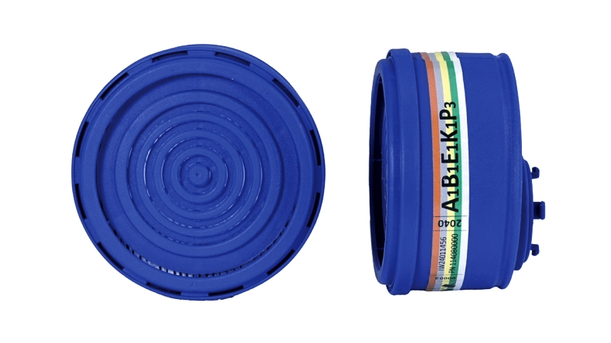 Combined cartridge/ filter, class 1 for gas protection and class P3 for particle filter, according to EN 14387:2021.